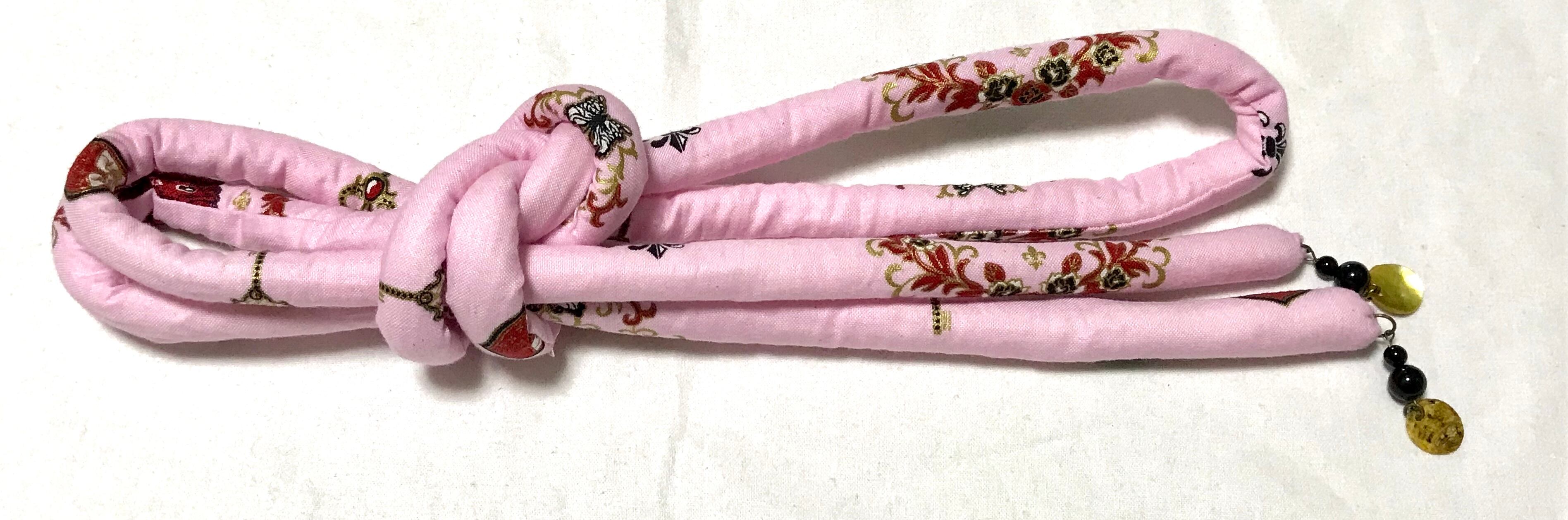 ピンク地に赤や金のユリ、植物のエンブレム柄です。