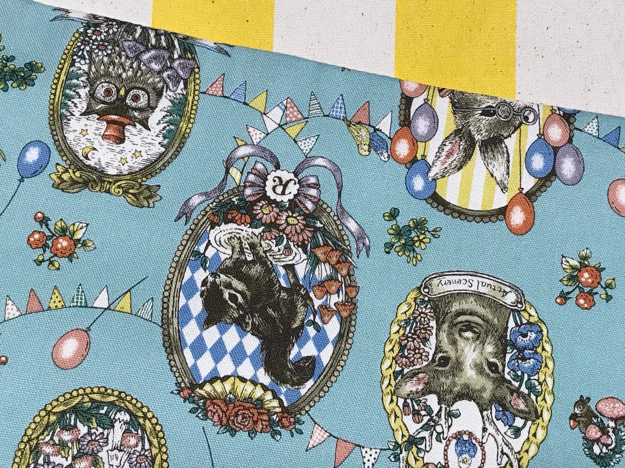 表・落ち着いた水色に兎などの森の動物柄 綿100%